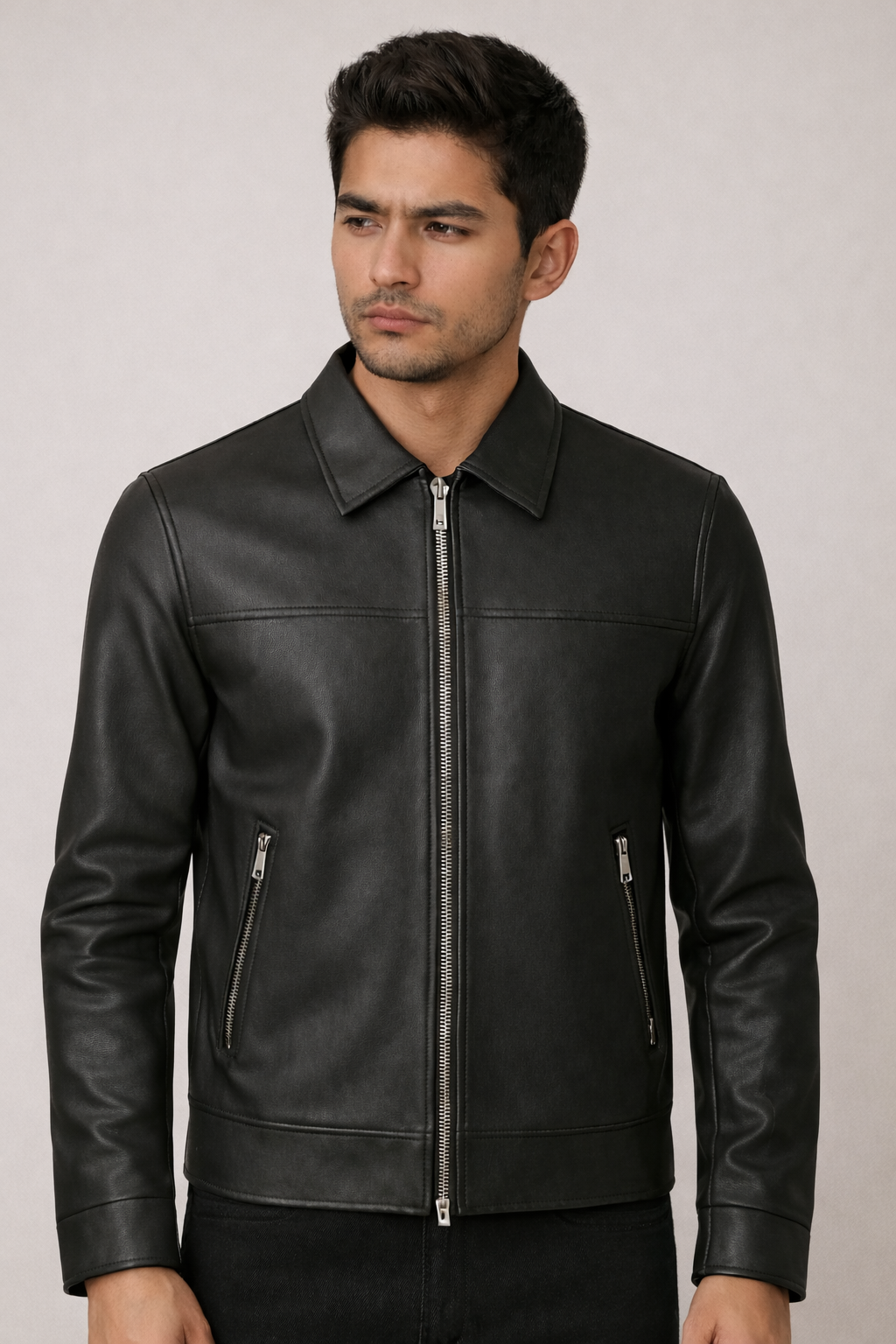 Upgrade your wardrobe with this premium men’s black leather jacket, designed for a sharp and modern look. Crafted from high-quality faux leather, this jacket offers a smooth finish, durable wear, and all-season comfort. The minimal collar design, front metal zipper, and sleek silhouette make it perfect for casual as well as semi-formal styling.