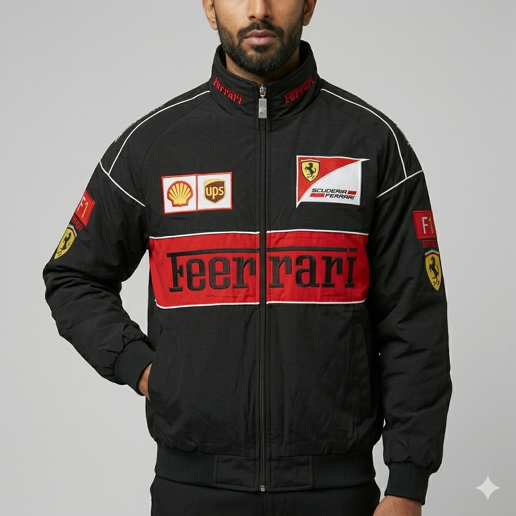 Ferrari Jacket is a striking Formula 1-inspired bomber, designed with a heavy focus on the “Scuderia Ferrari” racing aesthetic. It’s a high-energy piece that blends professional team apparel with modern streetwear.